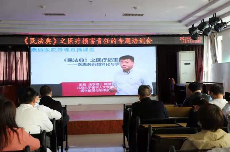 为进一步提高全院医护人员的医疗风险防范意识,使医护人员了解《民法典》中关于医疗损害侵权责任的法律规定,3月4日下午,我院组织观看北京燕园医院管理远程直播课堂。医院班子成员及全体中层干部参加了培训。